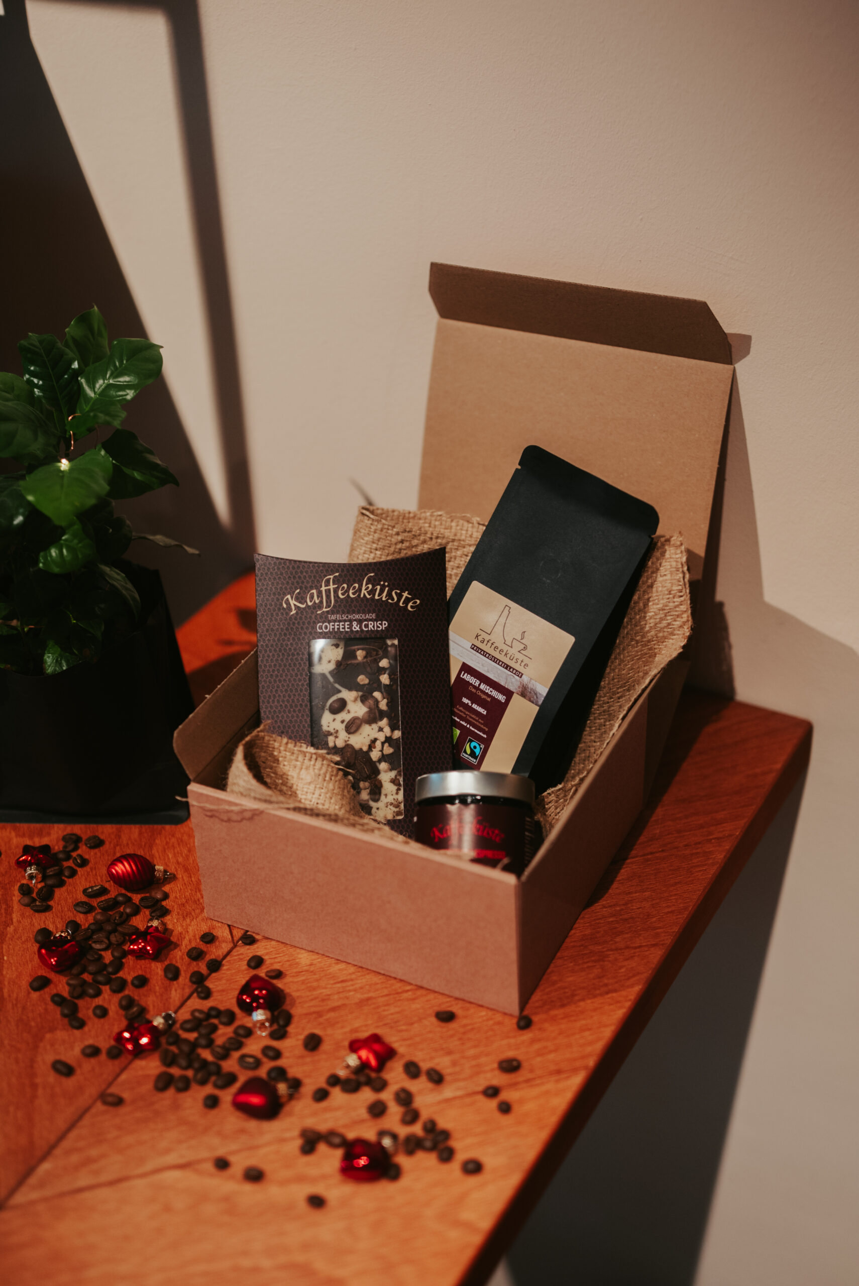 Die Geschenkbox bringt festliche Stimmung in jede Kaffeepause. Hochwertiger Kaffee trifft auf handwerklich hergestellte Schokolade und fruchtige Süße. Perfekt für Genießer und als stilvolles Geschenk zur Weihnachtszeit.